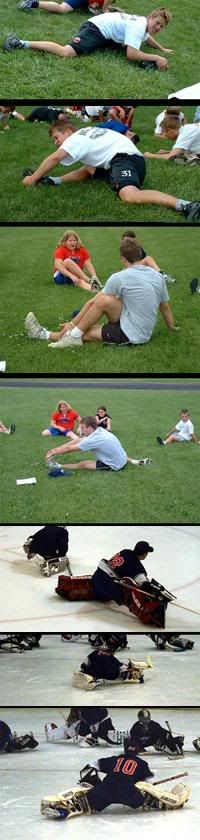 | The hips are the target area for stretching. there are also some mechanics involced that are a must to get any kind of real width. bear in mind that extreme width is not a requirement for bfly use. The wider your fly becomes, the more risky it gets. Being ran into while very wide can put you over backwards leading to some serious injury risks. you need to keep a well rounded stretch routine as well as some added attention to the hip and groin stretching. ![]() ![]() ![]() ![]() ![]() check the goalie downloads for more infor on hte mechinics of basic and advanced Butterfly.. http://www.hawksice.com/tips.html |